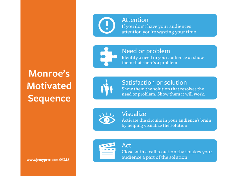 Like a great outline doesn’t make a great film, Monroe’s Motivated Sequence won’t — own its own — make a great speech. But does give you a structure to work with.